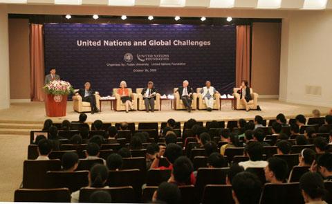 新闻中心讯 2009年10月30日,联合国基金会董事会一行访问我校,并在光华楼与我校300余名学子就“联合国与全球挑战”的主题进行座谈。