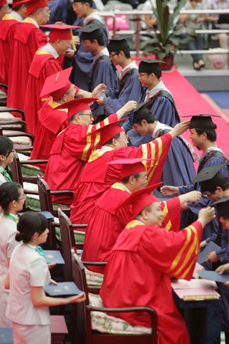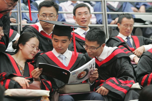 7月2日下午,2010届研究生毕业典礼暨学位授予仪式在正大体育馆隆重举行。校领导秦绍德、杨玉良、陈立民、蔡达峰、桂永浩、金力和导师代表杨福家、李大潜、俞吾金、冯晓源等人在主席台前排就座。2010届全体毕业研究生、校学位委员会委员、研究生导师代表、各院系党政领导、部分机关部处负责人以及毕业生家属代表3000多人出席了大会。
