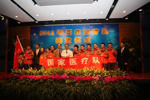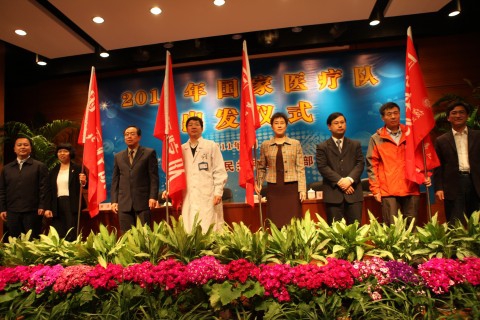 当日上午,卫生部在复旦大学附属中山医院举行简朴而热烈的“2011年国家医疗队出发仪式”,由卫生部有关领导向三家医院代表和国家医疗队云南分队代表授旗,标志着“国家医疗队”巡回医疗项目正式启动。
