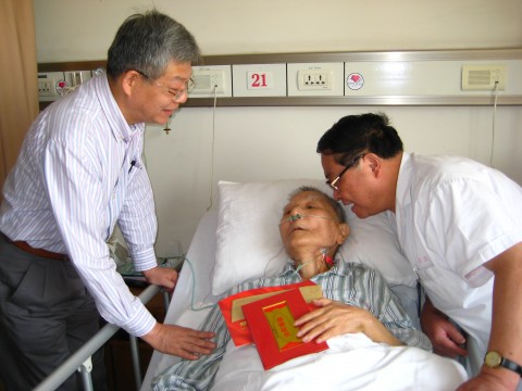 在建党九十周年临近之时,校党委书记秦绍德、校长杨玉良、党委副书记王小林、副校长桂永浩等校领导率队,分路专程前往华东医院、中山医院走访慰问了原复旦大学党委书记林克、原上海医科大学党委书记金乃坚、原校长张镜如及部分因病住院的离退休干部。校领导将问候和祝福送到老干部的病床边,将上海市委组织部、老干部局为离休老干部特制的纪念证章、学校党委为离退休老干部特制的荣誉纪念证书、组织部给党龄满五十年以上党员及老干部的慰问卡送到他们的手中,声声问候,如沐春风,饱含了学校对老前辈为党的事业,为学校的发展奉献一生的感激之情。在亲切的交谈中,校领导握着老干部的手,悉心地询问病情及医治情况,鼓励他们一定要有信心,配合医生,战胜病魔,早日康复;汇报了学校在“十二.五”开局之年的重大举措,进一步明确创建世界一流大学的目标及“大医口”改革的进展和深化,还认真地听取了老干部的建言和献策,并对老干部们长期以来为学校的建设和发展所作出的不可替代的作用和贡献表示衷心感谢。校领导的来访使老干部们温暖于心,对组织的信任和依恋是老干部们战胜疾病,乐享晚年的精神力量。