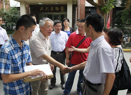 党委书记秦绍德、党委副书记陈立民在报到现场看望新生及家长。