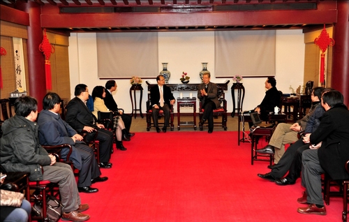 签约仪式前,校长杨玉良会见了全国政协委员、香港中华总商会会长、全国工商联合会常委、香港新华集团主席蔡冠深校董一行。复旦大学前校长王生洪陪同会见。副校长冯晓源、蔡冠深分别代表双方签字。