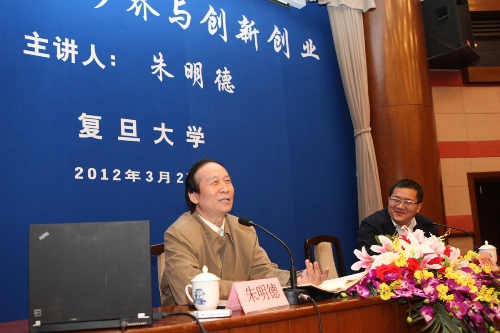 校党委副书记陈立民在讲座之前会见了朱明德教授,并对朱教授的到访表示热烈欢迎。讲座伊始,朱教授就和大家畅谈了他与复旦的不解之缘,他认为复旦和哈佛在大学精神方面有很多相似之处,以至于自己时常将这两所大学弄混。因此,他也勉励在座的大学生们能够以这一标准要求自己,不仅在学业上刻苦学习,也要在个人的文化艺术修养上有所提升。