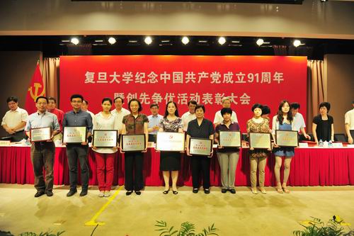 另悉,在建党91周年之际,上级党组织也表彰了一批创先争优先进基层党组织和优秀共产党员。我校中山医院护理党支部荣获“上海市创先争优先进基层党组织”称号;管理学院信息管理与信息系统系党支部、上海医学院生理与病理生理学党支部、校部机关枫林校区退休党支部、华山医院感染科党支部、儿科医院护理党支部、外国语言文学学院2010级本科生党支部、化学系2009级博士生党支部、法学院2010级法律硕士第一党支部荣获“上海市教卫党委系统创先争优先进基层党组织”称号;钟扬、彭希哲、张新夷、禹永春、韩秀引、钱冬生、曾昭冲、刘鲁明、申宸等9位同志荣获“上海市教卫党委系统创先争优优秀共产党员”称号。