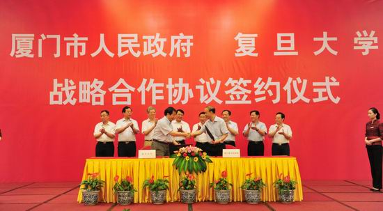 复旦大学常务副校长陈晓漫和厦门市副市长黄强代表双方签署战略合作协议。协议明确了双方在决策咨询、科技创新、医疗卫生等方面的战略合作内容,其中包括复旦大学将围绕东南国际航运中心、两岸金融中心和文化休闲旅游中心建设,与厦门市合作开展相关战略研究;厦门支持复旦大学与厦门大学联合申报“2011计划”能源化学材料协同创新中心;围绕海西高端制造业基地、自主创新基地建设,与市内企业、科研机构共同建设科技创新中心;复旦大学接受厦门市选派优秀临床医学毕业生到附属医院上海住院医师规范化培训基地进行培训;复旦大学将选派学术骨干和管理骨干,以挂职等形式参与厦门大学新建附属医院建设。