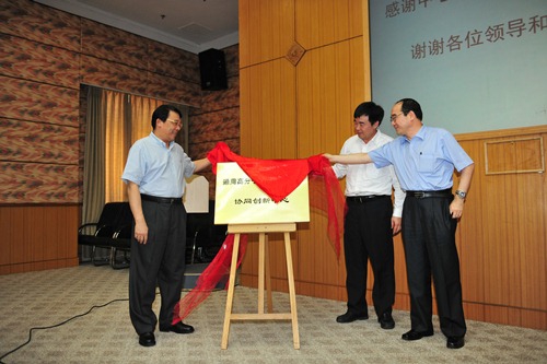 朱之文、乔金樑和王治卿共同为通用高分子材料高性能化协同创新中心揭牌。金力、乔金樑和王治卿分别代表复旦大学、北京化工研究院和上海石化讲话。
