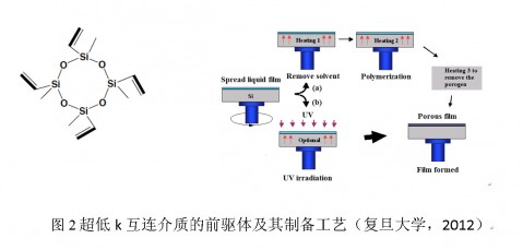 在22纳米 CMOS技术节点,为降低成本、减少功耗和提高器件性能,需要引入新的工艺如栅工程、超浅结源漏、应变沟道和先进互连技术等。复旦大学张卫教授课题组的研究工作主要集中在超浅结源漏和互连工艺。我们提出了极限超薄可控金属硅化物工艺,以及超浅结低温微波退火激活技术。如图1所示,金属硅化物接触电阻< 10-7 cm2;金属有效肖特基势垒高度<0.1eV;PMOS结深<18 nm,满足22纳米CMOS器件的需要。在互连技术上,探索多种超低k互连介质并将之整合到铜互连工艺中。如图2所示,这种超低k材料的前驱体分子本身就有个纳米环,采用这种特殊的前驱体后,可以通过C-C桥联键将纳米孔结构均匀地分布在薄膜中,在降低薄膜k值的同时可以获得较强的薄膜机械性能。此外,我们优化纳米通孔的铜互连电镀新工艺,实现了无孔洞的Cu电镀,如图3所示。
