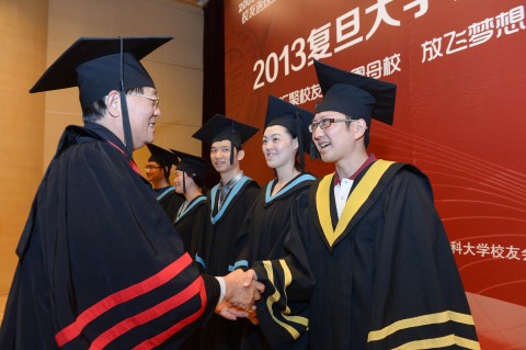大会的最后,时任校长王生洪教授发表热情洋溢的讲话,为当年的学生送上了深情的回忆和美好的祝福。王校长与03届的校友同时来到复旦,担任校长。2003年,SARS爆发,复旦人勇于面对,攻坚克难。由闻玉梅院士主持的复旦大学教育部卫生部病毒学重点实验室日夜奋战、公共卫生学院姜庆五院长等冒着生命危险,南下北上,深入一线,很多复旦人为最终攻克SARS做出了不可磨灭的贡献。十年后,复旦的分子病毒实验室主任袁正宏教授团队又为H7N9病毒的研究作出突出贡献。无论是十年前的攻克SARS,还是近期的H7N9病毒,复旦人“团结、服务、牺牲”的精神都在危难的时刻得到了最精彩和生动的诠释。讲话中,王校长谈到了近十几年来同学们所经历的复旦、上海和中国发生的大事,激起了校友们对大学生活的深情回忆,产生了强烈的共鸣。最后,王校长表示,因为SARS的原因,学校当年没能为03届同学举办全校性的毕业典礼,这是很大的遗憾,他深表歉意。在档案馆馆长周桂发的精心策划下,5位03届校友代表重新穿上学士服,走上主席台,实现了完成“毕业典礼”的梦想和心愿。王校长高兴地亲自为他们一一拨穗并合影。这迟到十年的“毕业典礼”的场景,全场掌声和欢笑声雷动,将活动推向了令人振奋的高潮。