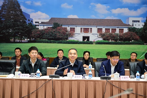 朱之文代表复旦大学对范锐平部长一行表示热烈欢迎,并介绍了复旦大学的整体发展情况。他指出,复旦大学处在改革发展的关键时期,学校正在深入推进内部治理体系、校院管理体制、人才培养机制等多个领域的综合改革,正在加快实施五大战略,深入抓好创新人才培养、学科队伍建设、创新平台建设和校园规划建设等,努力服务国家战略和区域发展。复旦希望能发挥自身的优势特长,积极拓展与四川省的全方位合作,提升合作的层次和水平,推动一批省校合作项目落地,取得实实在在的成效。