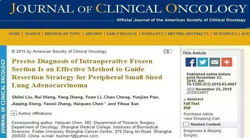 我校附属肿瘤医院胸部肿瘤多学科综合诊治团队准确描述并定义了周围型肺腺癌的术中冰冻病理分型,同时以此提出了兼具微创、精准和疗效三位一体亚肺叶切除手术方式的精准指征。相关研究成果于近日在国际肿瘤领域权威学术期刊《临床肿瘤学杂志》在线发表,为解决长期存在于肺癌治疗领域亚肺叶切除术指征的争议做了有益的探索。