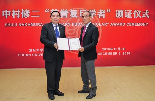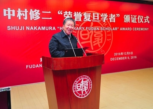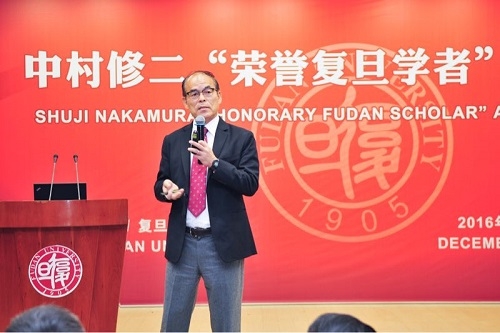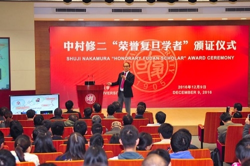 新闻中心讯 12月9日上午,中村修二“荣誉复旦学者”颁证仪式暨学术报告会在我校光华楼袁天凡报告厅。常务副校长包信和为诺贝尔物理学奖获得者、美国加州大学圣芭芭拉分校教授中村修二(Shuji Nakamura)颁发复旦大学荣誉学者(Honorary Fudan Scholar)证书。科技部原副部长曹健林在颁证仪式上致辞。