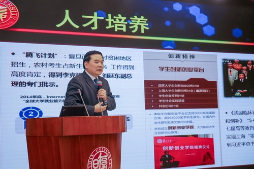 包信和在本次会议期间介绍了“双一流”建设背景下的复旦大学通识教育模式。《复旦大学章程》规定,学校培养具有人文情怀、科学精神、国际视野、专业素养的人才。“十三五”规划中,复旦大学本科教育强调以“学为中心”的教学改革,按照“以学生发展为中心”设计方案,基于“大类招生、通识教育、专业培养、多元发展”的人才培养理念构建通识与多元选择有机结合的“2+X”培养体系。“2+X”即本科前两年着重开展通识教育和大类基础教育,培养学生懂中国、懂社会,文理相通、中外并蓄;从三年级开始,根据学生个性化、多元化成长的需求,构建互相贯通的多维发展空间。本科生在学校提供的弹性学制范围内,既可以在本专业继续纵向的深入学习,也可以在培养方案允许的范围内开展更多的跨学科横向学习,或参与各类创新创业实践等,接受交叉融合培养,实现自由开放、多元并进的全面发展。