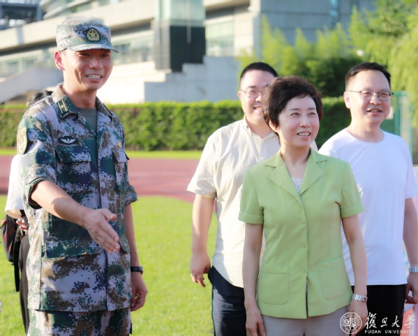在南区体育场军训点,焦扬代表学校党委向承训的31604部队军训团团长和教导员们表示衷心感谢。此次学校军训人数多,两届学生共同参与,史无前例,再加上持续的高温天气,给承训教官和参训学生都带来很大挑战。感谢部队同志能够在繁忙的军事任务和军事训练当中,抽出时间来到学校,帮助我们进行国防教育和军事训练,给了复旦大学极大的支持。关照承训官兵在严格带教同时,也要注意高温天自己做好防护。