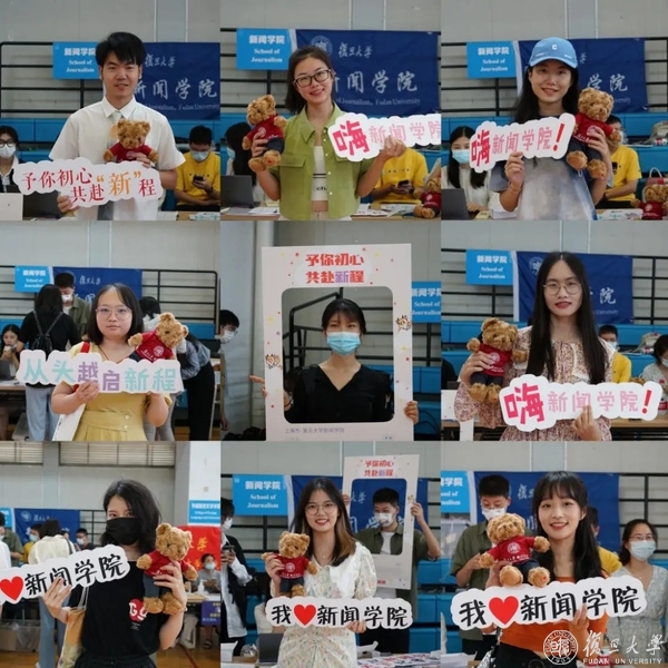 经济学院、新闻学院等各式各样的趣味道具供新生同学们拍照打卡,纪念这开启崭新生活的一瞬间。