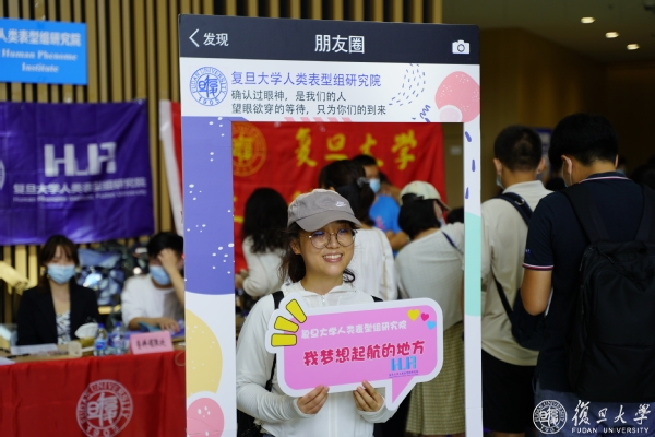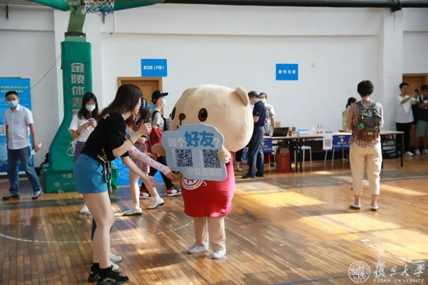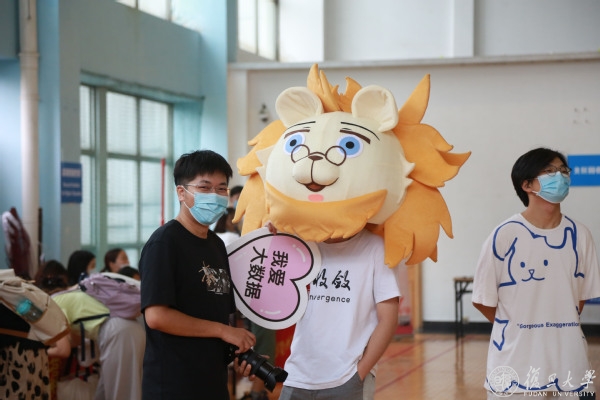 泛海国际金融学院今年精心准备了新生入学照拍照处。在标志着“启航”的蓝色背景板前,金融专硕项目的同学们纷纷拿着项目吉祥物小牛与“我爱复旦”等举手牌打卡,留下了作为研究生新生的第一张照片。
