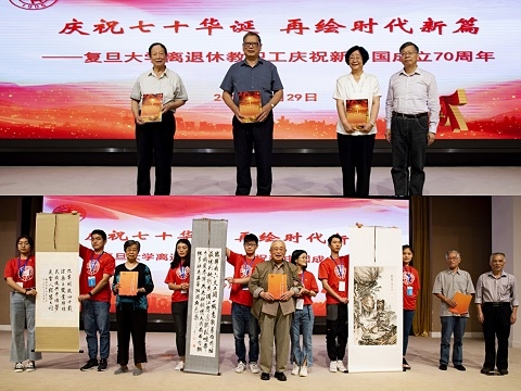 为庆祝新中国成立70周年,今年,学校组织5300多位离退休教职工以丰富多彩的形式献礼国庆。以“我和我的祖国”、“我与共和国共成长”为主题,共征集共和国同龄人征文19篇、“读懂中国”访谈22篇、其他征文20篇、诗歌28篇、书画摄影作品200多幅;从事老年人公益事业的“退休之后”公众号组织校友志愿者义务奉献,对共和国同龄人进行深入座谈和一对一的上门专访,采撷精彩故事,凝练成6分钟微视频,折射新中国与复旦沧桑巨变。大会现场,《回首七十年 奋进同路人》微视频、《壮阔七十年 奋进新时代——庆祝中华人民共和国成立70周年主题征文集》、《翰墨丹青书初心 捕光捉影记辉煌——复旦大学离退休教职工书画、摄影作品集》3份献礼同时发布。