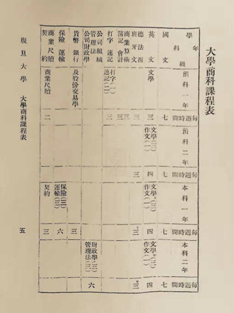 1920年复旦大学《大学商科课程表》