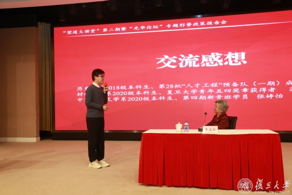 “毛主席说,世界是你们的,也是我们的,但归根到底是你们的。中国的未来要靠年轻人,你们是家里的接班人,也是国家的接班人,希望大家认真读书,为小家和大家奋斗!”下课前,黄宝妹对复旦青年郑重嘱托。