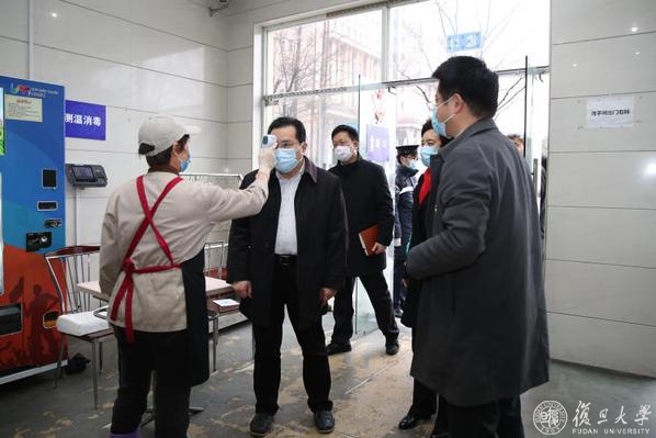 沈炜一行先后来到邯郸路220号复旦大学正门和旦苑食堂,实地调研检查疫情防控管理情况,对复旦大学加大对校门的管控、严格落实“五个一律两个必须”,和食堂采取出入口分离、减少人群聚集等做法给予充分肯定。
