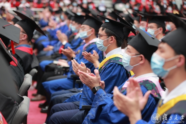 奋斗百年路,启航新征程。在毕业典礼开始前,全体师生一同唱响《今生永相伴》,一同聆听今年全新打造的原创歌曲《宣言》。“生命的火种已为明天点燃,希望的光默默照亮信念”。百年的历史记载着共产党人的初心使命,信念之光已照亮远方。复旦学子坚守初心,志在四方,将奋斗的汗水洒在广袤的祖国大地,在新时代大舞台上奉献青春。两首歌毕,典礼现场响起热烈的掌声。