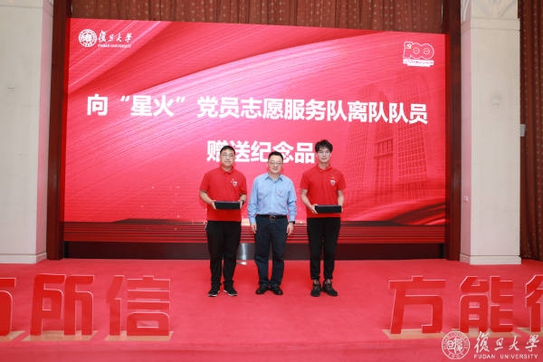 校党委副书记、副校长周亚明向“星火”党员志愿服务队毕业离队队员赠送纪念品,新老负责人进行队旗交接