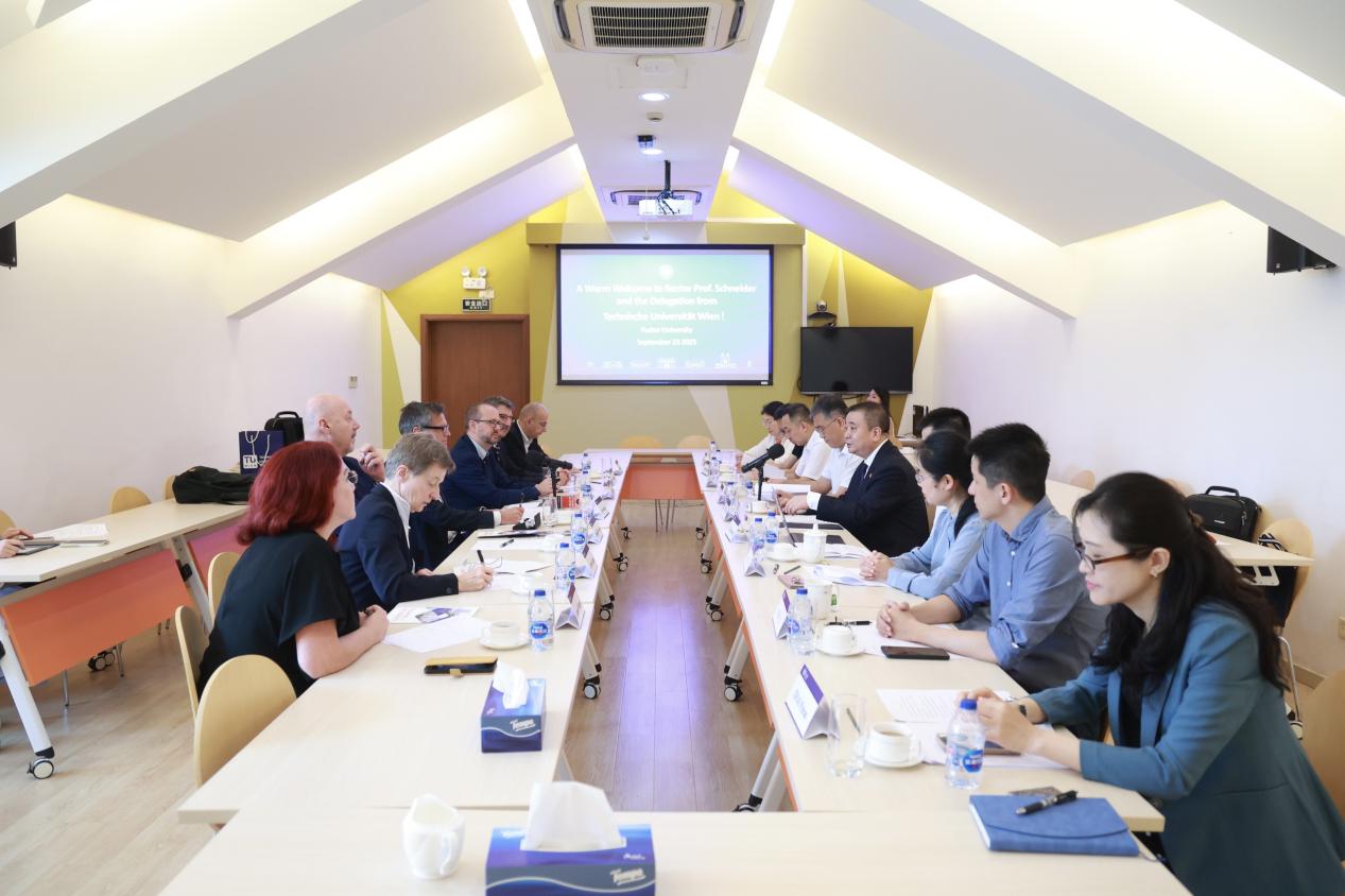 此次来访是维也纳工业大学校长首次到访复旦。施奈德表示,中国是奥地利重要的合作伙伴之一,维也纳工业大学一贯重视与中国顶尖高校的交流。维也纳工业大学始终以其在科研与工程领域的卓越成就而深感自豪,两校在理工学科的重点发展方向上高度一致,他期待与复旦大学携手,共同推进实质性合作项目。