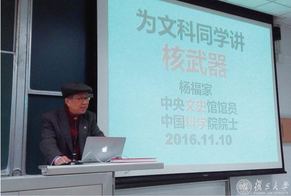 “一个科学家能把自己所有的知识和智慧奉献给他的祖国,使得中华民族完全摆脱了任人宰割的危机,还有什么比这更让人自豪、骄傲的呢?”2016年11月10日,杨福家为复旦大学文科学生开设核武器知识讲座,历数推动中国核事业发展的杰出贡献者,激励同学们学习科学家精神,为国家、为人民贡献全部力量。