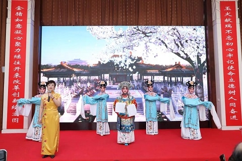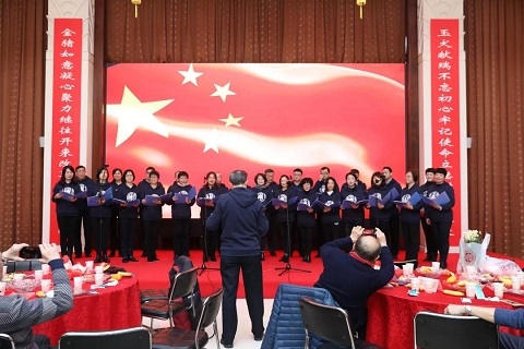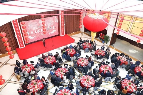光华楼13楼多功能厅内,透过半圆形的玻璃穹隆,和煦的阳光映照在一串串大红灯笼上,洋溢着喜庆的氛围。“玉犬献瑞不忘初心牢记使命立德树人同奋进,金猪如意凝心聚力继往开来改革创新绘宏图”,舞台两侧的对联格外醒目。
