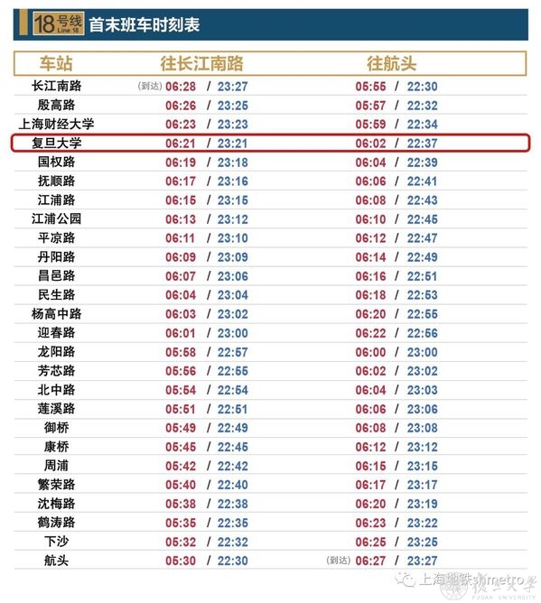 18号线首末班车时刻表