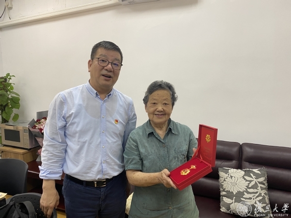 许宁生还来到哲学学院副教授金邦秋家中,将纪念章亲手颁与他。1961年入党的金邦秋长期从事马克思主义哲学、毛泽东哲学思想和中国现代哲学的教学和研究,退休后长期担任退休教工党支部书记且笔耕不辍,先后编著出版各类著作8本,发表学术论文60多篇。金邦秋在理论研究领域做出的杰出贡献得到了许宁生的高度肯定。