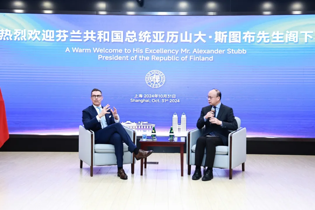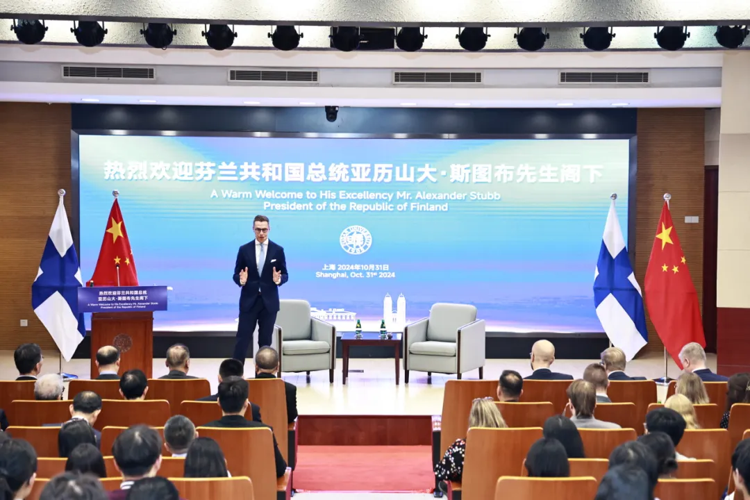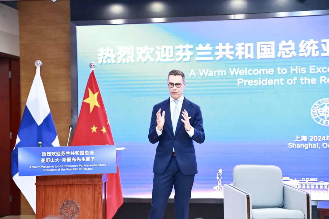10月31日上午,芬兰总统斯图布到访复旦大学,在光华楼袁天凡报告厅发表演讲,并与现场师生交流。