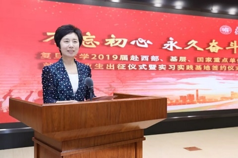 焦扬在致辞中向各位奔赴西部、基层、国家重点单位就业的2019届毕业生们表示祝贺,向校友代表表示欢迎,向各省(区、市)组织部门、重点单位对复旦事业发展的支持和对复旦毕业生的关心厚爱表示衷心感谢。她说,伟大的新时代呼唤更多有志青年把个人发展和国家发展前途紧密结合起来,在大格局中找准自己的坐标,在融入新时代、奉献新时代中实现人生的价值。今天,越来越多的毕业生选择去西部、基层、国家重点单位奉献青春、追逐梦想,去祖国最需要的地方和行业砥砺奋斗,让我们看到了新一代复旦人的理想、情怀、责任和担当,大家以青春作桨、以梦想扬帆,用实际行动践行着“团结、服务、牺牲”的复旦精神,值得我们大大点赞!