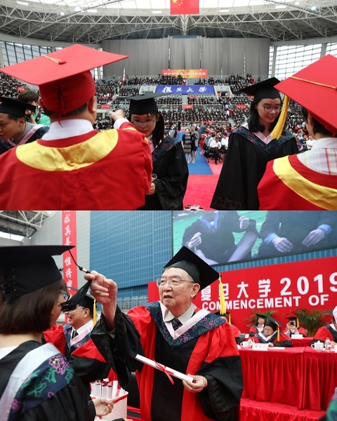 典礼上,全体2019届本专科毕业生迎来最具仪式感的时刻——在场嘉宾、导师代表为毕业生授予学位。帽穗从右边轻轻拨到左边,见证了学子们的成熟、成长、成才。