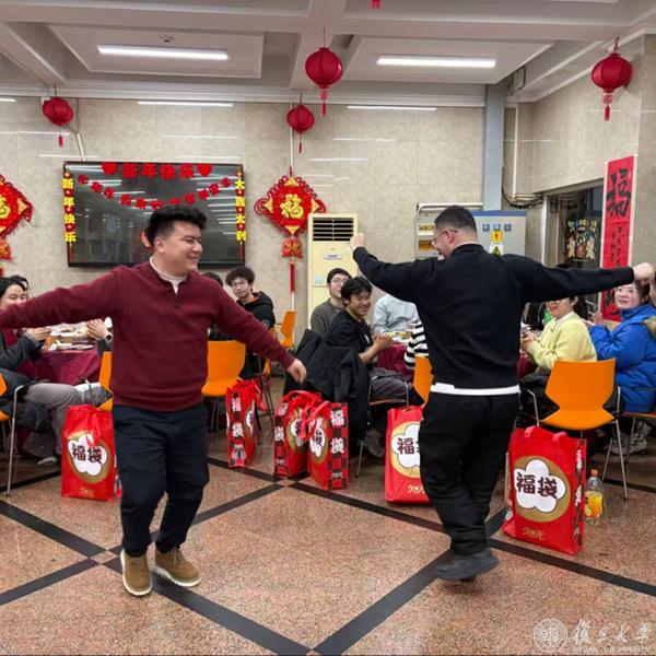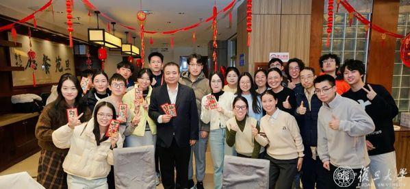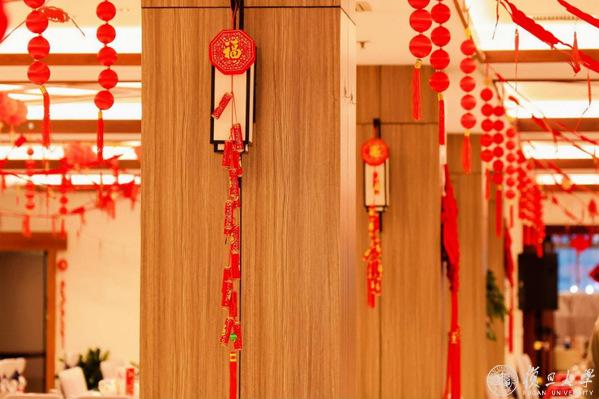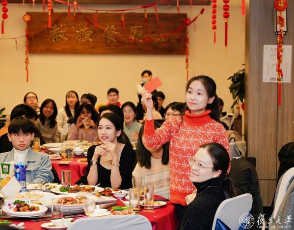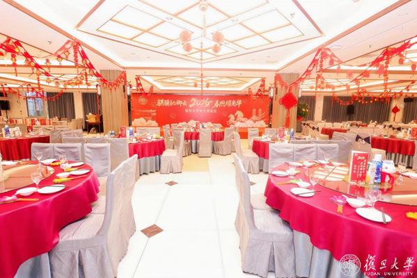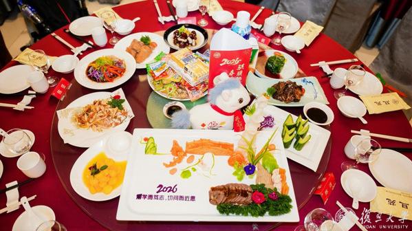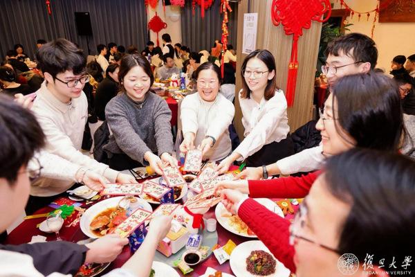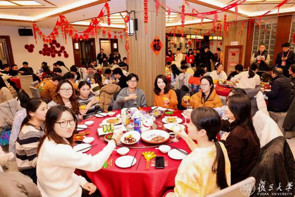 邯郸校区旦苑餐厅,张灯结彩、喜气洋洋。师生们围坐桌前,畅谈甚欢。