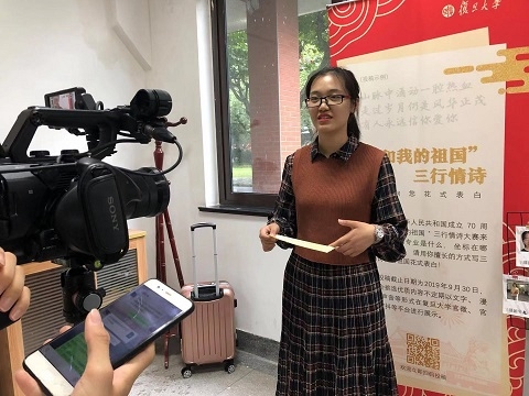 9月1日当天,“我和我的祖国”三行情诗现场朗诵活动在校内火热举行。新生们深情诵读对新中国70岁华诞的美好祝福,开启与祖国同行、与时代奋进的新征程。投稿征集将于9月底截止,并陆续将以文字、声音、视频等形式在复旦大学微信、微博、抖音等新媒体平台展示。
