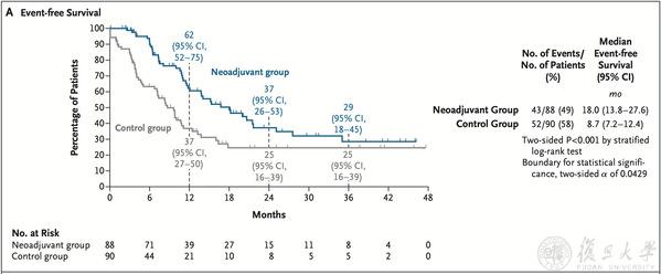 在肿瘤退缩与手术效果方面,新辅助组患者客观缓解率(ORR)达55%,R0切除率高达95%,中位无复发生存期(RFS)达15.4个月,较对照组(9.7个月)明显延长,复发风险降低31%。